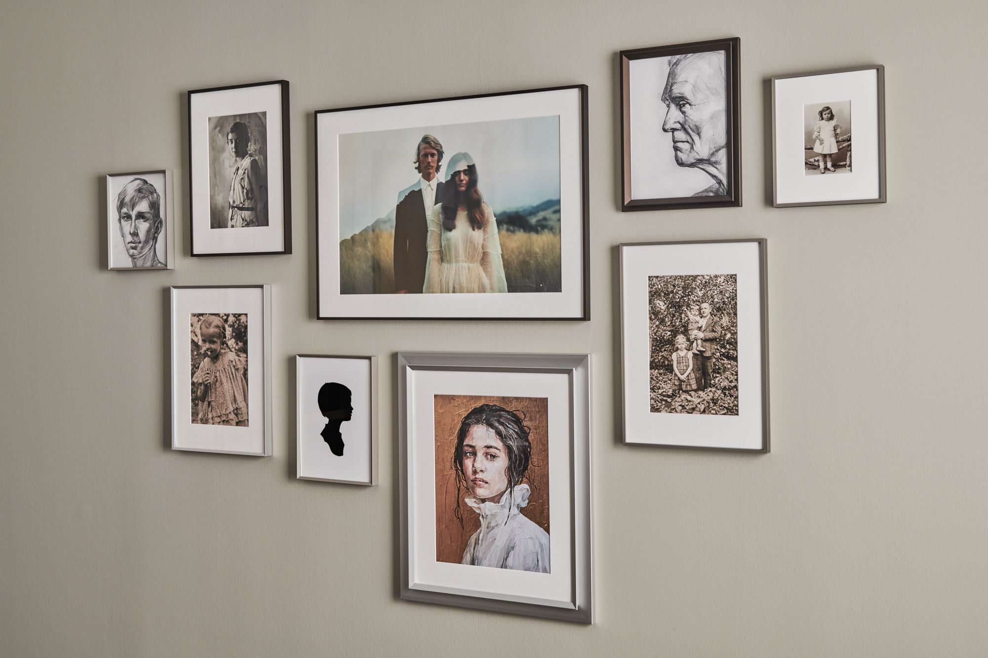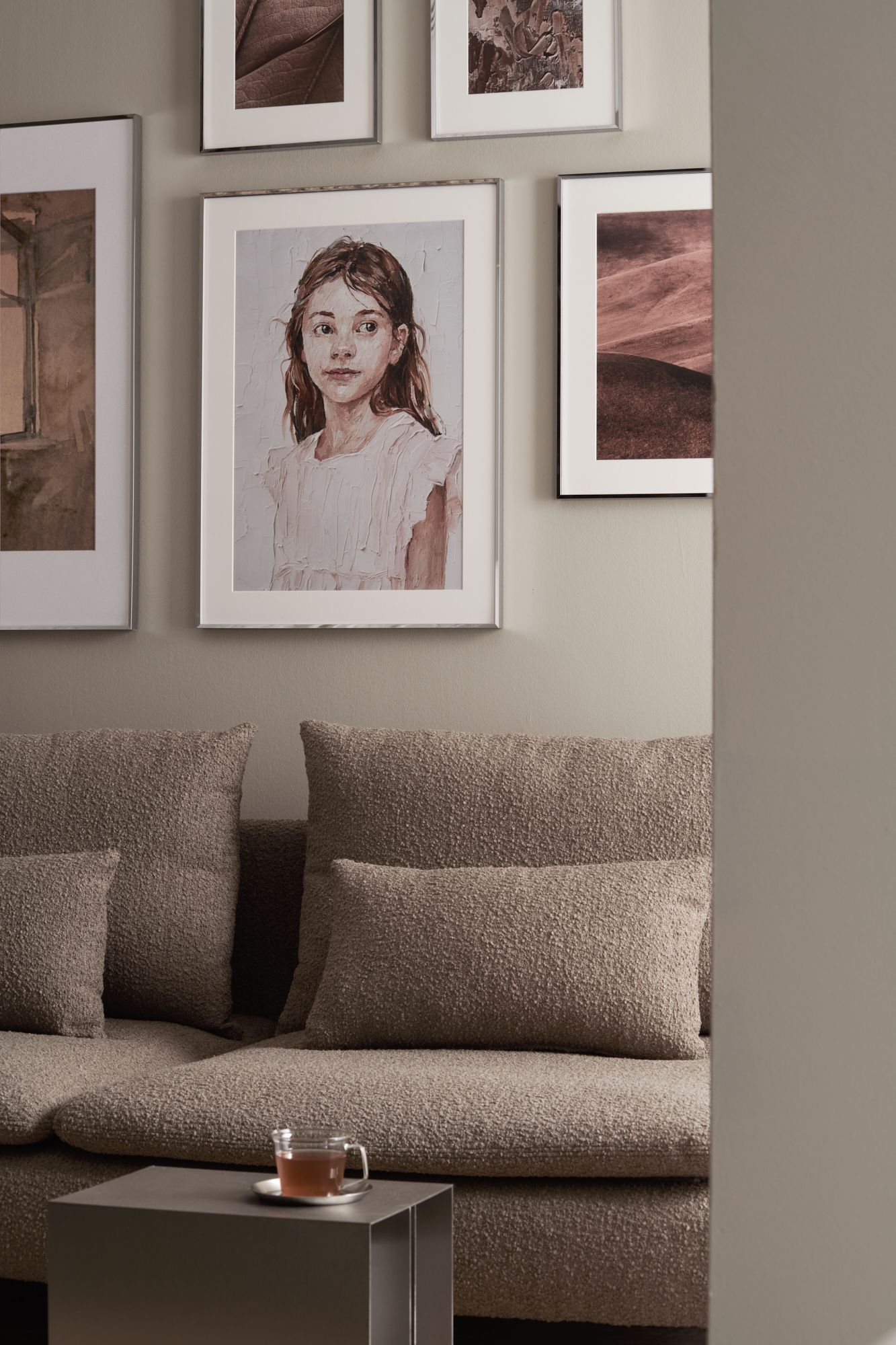 Die matte Oberfläche eines Bilderrahmens aus Alu Sandsilber wirkt frisch, klar und angenehm zurückhaltend. Nichts glänzt, nichts drängt sich auf. Stattdessen entsteht eine ruhige Präsenz, die dem Raum Struktur verleiht, ohne ihn zu dominieren.