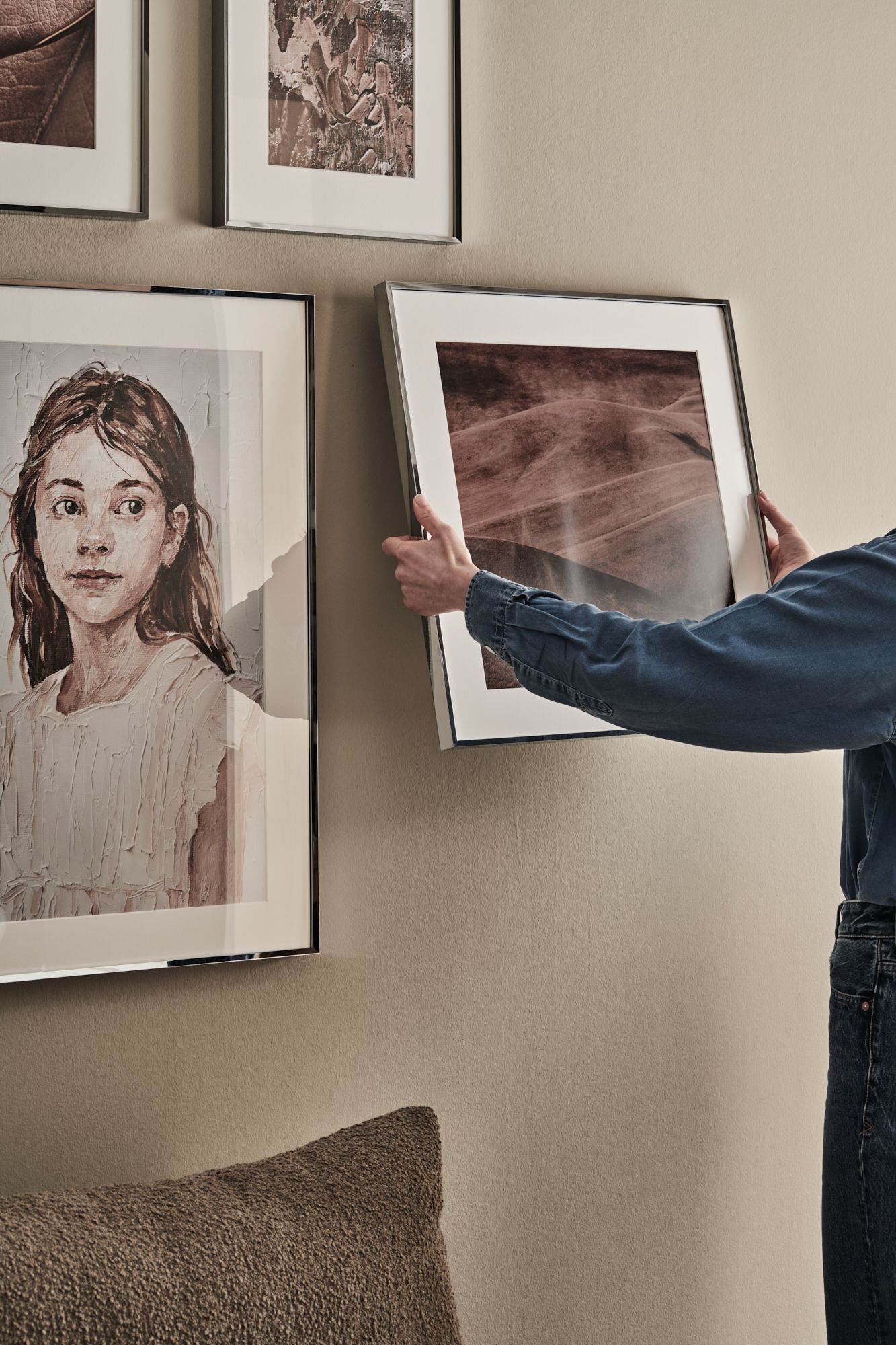 Alu-Bilderrahmen wirken klar und architektonisch. Besonders in Sandsilber nehmen sie sich zurück, setzen keine verspielten Akzente, sondern erzeugen Ruhe durch die Linienführung im Raum. Chrom hingegen lebt von seiner Inszenierung: In farblich ruhigen Räumen wirkt es elegant, in kontrastreichen Settings bewusst präsent. Chrom kann leise - oder Statement.
